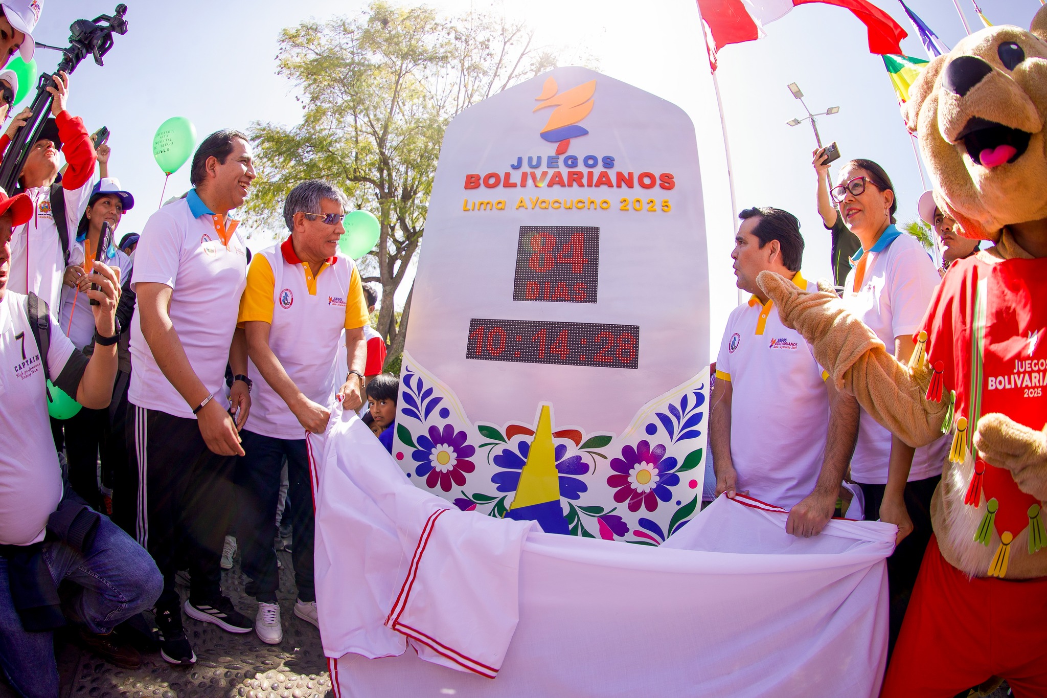 El evento tuvo lugar en la Plaza Mayor de Huamanga, donde la máxima autoridad regional brindó un mensaje de bienvenida a los asistentes y se procedió a la develación oficial del reloj de cuenta regresiva de los Juegos Bolivarianos en Ayacucho, símbolo de preparación y expectativa hacia este importante certamen internacional.